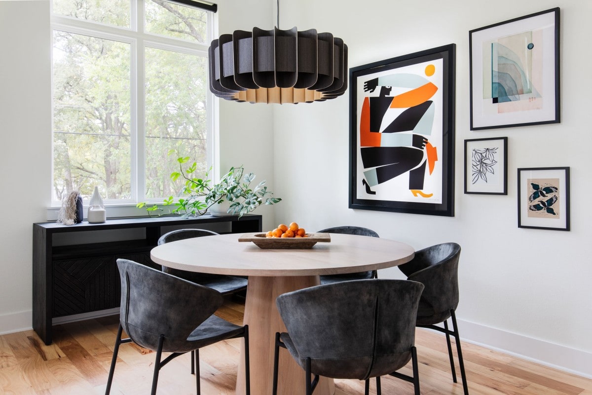 In our Barton Hills project we created repetition of shape using a circular dining table, circular lighting fixture, and chairs with a curved back that continue the visual effect of circles radiating outward. The color orange is also repeated on the gallery wall, the tangerines on the tabletop and the warm gold hue on the interior of the lighting fixture.